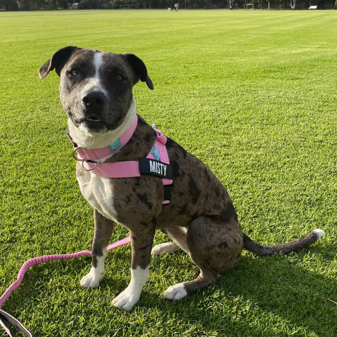 Below, you’ll see Misty wearing two different harness designs during activity — photographed from multiple angles to show strap placement and front leg extension clearly.